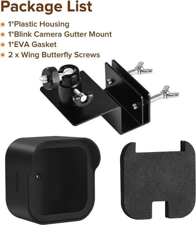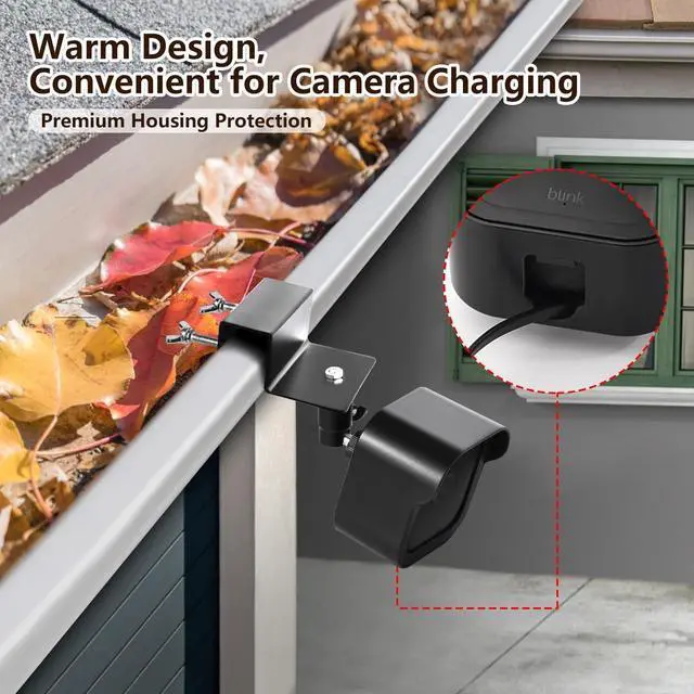 Weatherproof Housing and Anti-rust Mount Made of hard plastic material and designed with full coverage, withstands harsh weather conditions, extends the working life of your blink camera. Built with durability in mind, our gutter mount features a construction of aluminum alloy, enough strong and secure to hold your blink outdoor 4, no fear of falling off and Anti-rust.