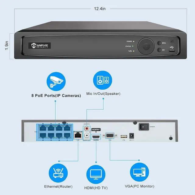 Reliable PoE Security System: Power over ethernet provides a more stable power and video signal for your system, offering greater transmission distance compared to POE. Save on installation costs with true power over ethernet - simply plug in the 8 ch NVR and connect the cameras. This 4K NVR comes with 8 POE Ports, allowing connection of up to 8*8MP/6MP/5MP/4MP/1080P IP cameras.