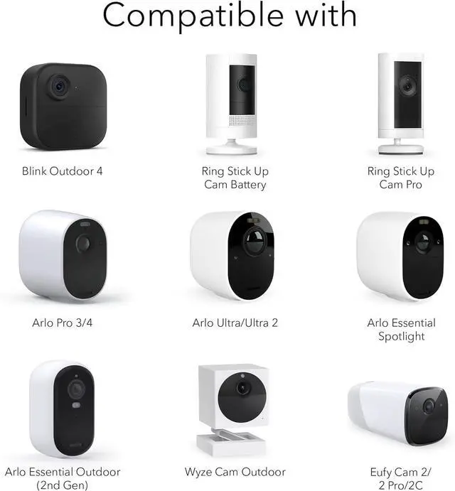 COMPATIBILITY - Compatible with Blink Outdoor/Blink Outdoor 4/XT2/XT, Ring Stick Up Cam/Cam Pro Battery, Arlo Essential Spotlight/ Outdoor 2nd Gen, Arlo Pro 3/4/5, Arlo Ultra/Ultra 2, EufyCam 2Pro/2C, and Wyze Cam Outdoor (not compatible with Ring Super Solar Panels)