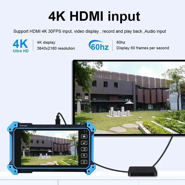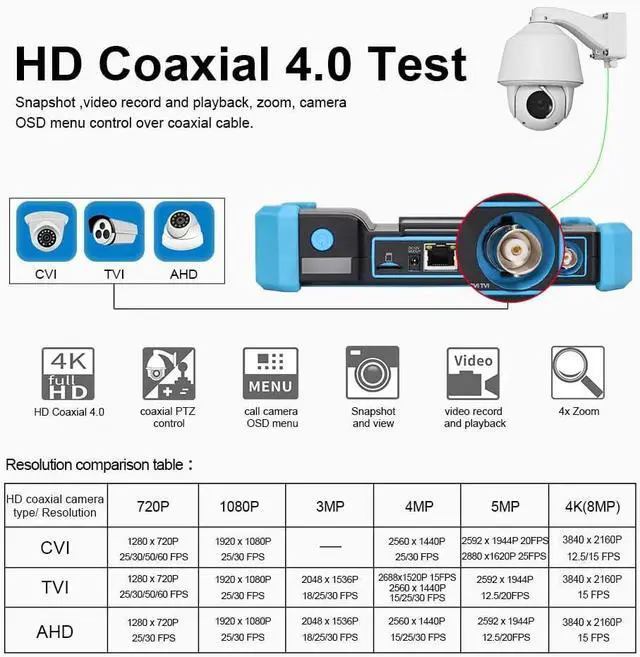 4-in-1 Coaxial CCTV camera testSupport max 8MP (3840x2160P) TVI / AHD / CVI camera test, support UTC PTZ control and call OSD menu. Built-in " Auto HD" APP can automatically recognize the camera type when viewing HD AHD / TVI / CVI cameras. And CCTV tester also support CVBS analog camera test.