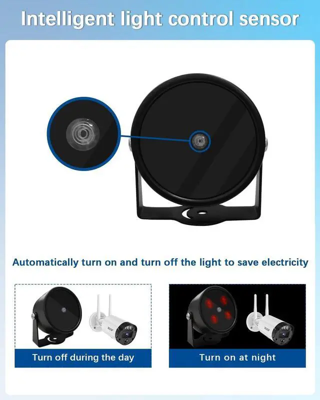 Automatic ON & OFFWith its built-in infrared flood light sensor, the security camera infrared illuminator will be self turn on at dusk and turn off at dawn, its in energy saving mode. Wave length 850nm infrared light, largely improves camera image quality in low-light or in pitch-dark, giving you a clear bright view at night.