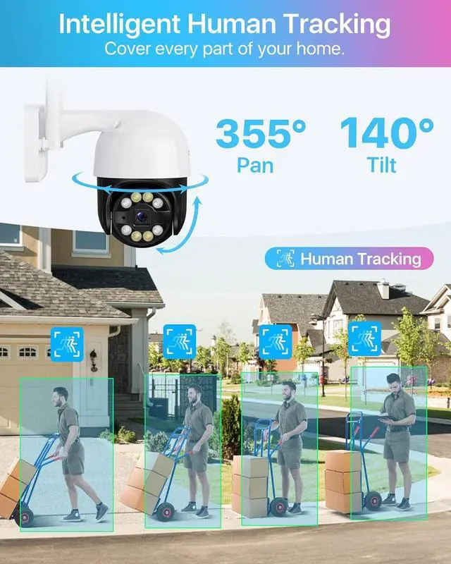 355° Pan/Tilt & Human TrackingThis PTZ camera can rotate 355° horizontally and 140° vertically to cover every angle and leave no blind spot. It could auto tracking the moving person, so it would not miss any human motion events.