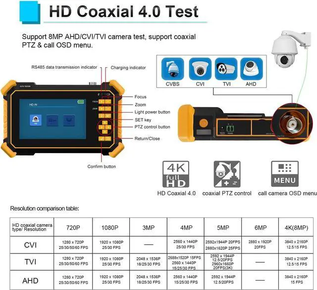 Multi-Format HD Aanlog Camera Testing Supports 8MP AHD/TVI/CVI cameras and analog CVBS systems, with auto-recognition via HD app to display resolution (up to 4K) and frame rate in real time. Features coaxial PTZ control and OSD menu access for seamless camera configuration and debugging.