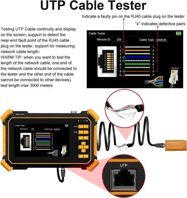 UTP Cable Diagnostic Tool Tests RJ45 network cable continuity, identifies near-end fault points, and measures length up to 3, 000 meters (requires one end connected to the tester). Ideal for pre-installation cable checks in CCTV setups.