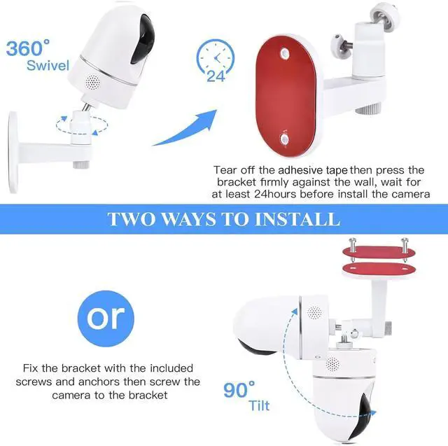 Easy installation with screws or adhesive tape, two mounting ways for your choice. (Note: After the adhesive tape, wait for at least 24 hours before installing the camera. )