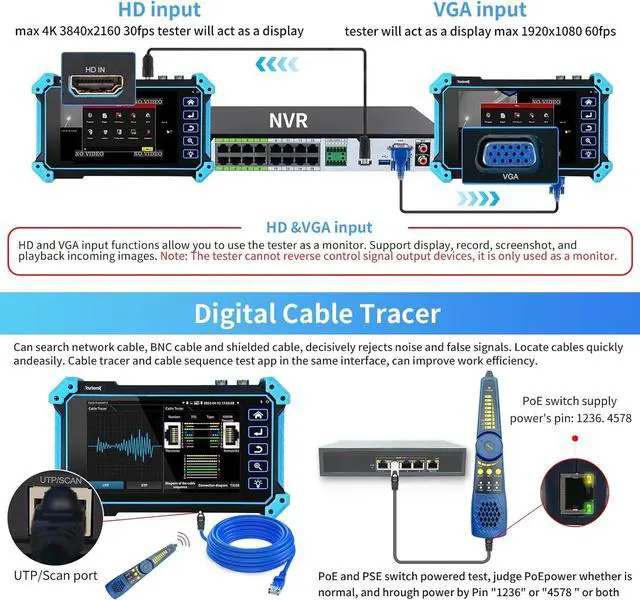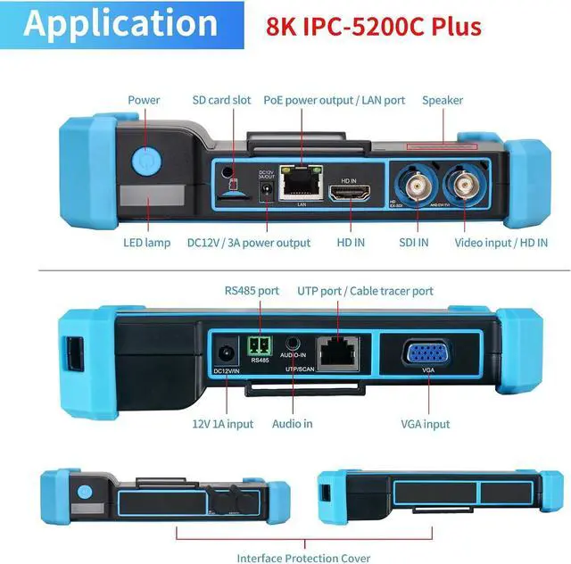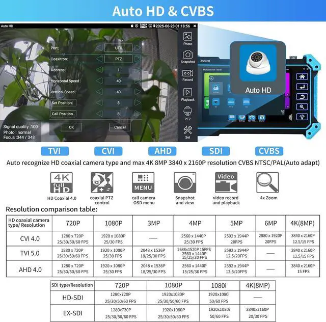 Coaxial CCTV camera testSupport max 8MP (3840x2160P) TVI / AHD / CVI / SDI camera test, support UTC PTZ control and call OSD menu. Built-in " Auto HD" APP can automatically recognize the camera type when viewing HD AHD / TVI / CVI / SDI cameras. And CCTV tester also support CVBS analog camera test.