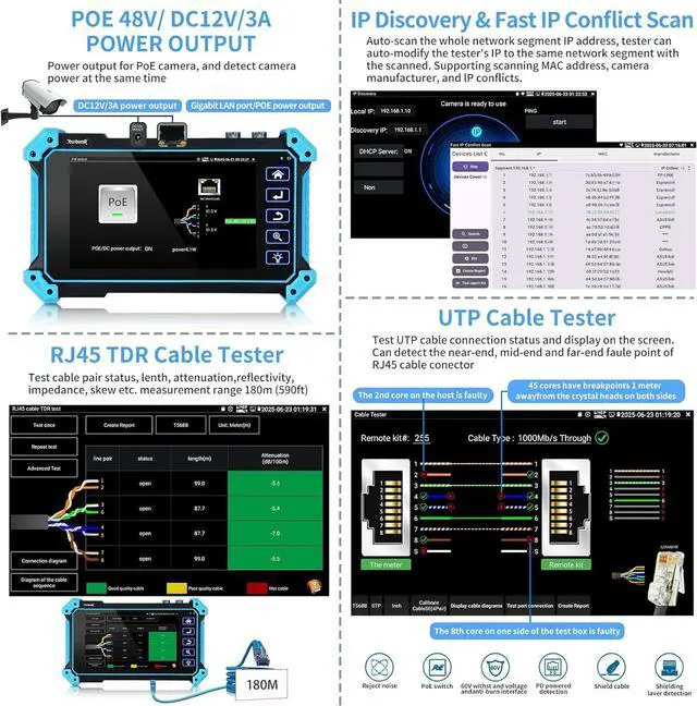 Max 8K 32MP IP Camera TesterNetwork camera tester support max 8K 32MP 12MP 4K H. 265/H. 264 IP Camera test. Powerful network tools to help you detect and set various network parameters. Support PoE IEEE 802.3 af/at 48V, maximum power 25.5W, UTP cable test, POE power output RJ45 TDR cable test.