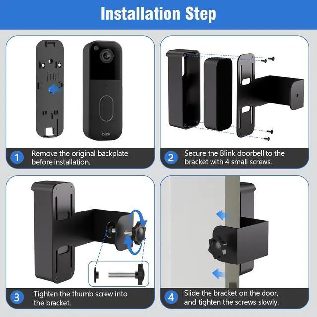 No-Drill & Easy InstalltionBlink doorbell holder with no drilling neededdoor. Just put your doorbell into the protection shelland combine the shell to the stainless steel bracket with screws, then adjust the fixed clip and secure it to your door.