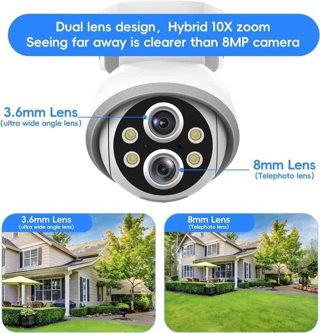 Easy Installation & US Cloud StorageMMQ WIFI camera needs to be plugged into the power supply, plug and play. The outdoor/indoor surveillance cameras are equipped with 10x hybrid zoom dual lenses ( 2.8 mm and 8mm) for high-definition color night vision. The cloud server is located in the United States. Using the Eseecloud APP to record videos to an encrypted cloud server helps avoid losing videos and ensures that all of your videos are safe and protected.