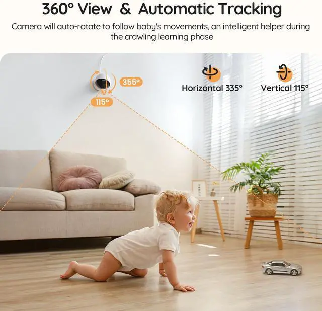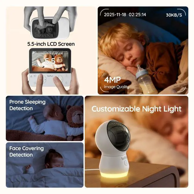 BOIFUN AI Baby Monitor with Camera and Audio, Safety Alerts (Tummy Sleeping & Face Area), WiFi Smartphone APP Control, Colorful Night Light, 2K HD Night Vision, Motion & Cry Detection, Two-Way Talk