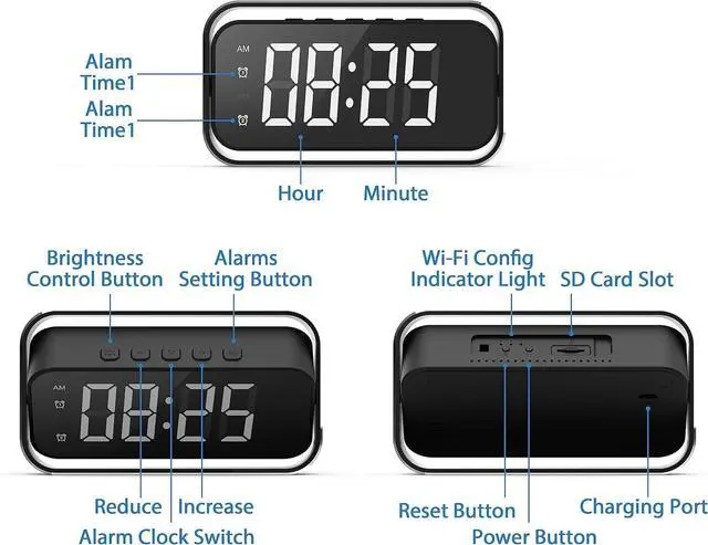 EXCELLENT ALARM CLOCK FUNCTION: Simple and generous fashion clock, support 12/24 hour system, the brightness of the font can be adjusted, the angle of the alarm clock can be adjusted up and down for better viewing by the camera, can set two alarm times simultaneously, meet all your need for a security camera.