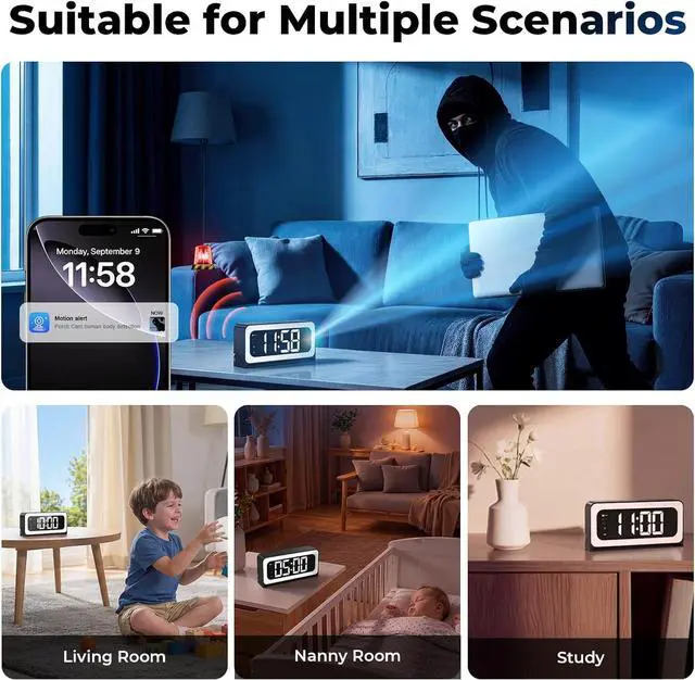Smart Security & Adjustable Night Light: Monitors abnormal dynamics 24/7 with instant phone alerts; night light and clock indicator have 3 brightness levels for different needs.