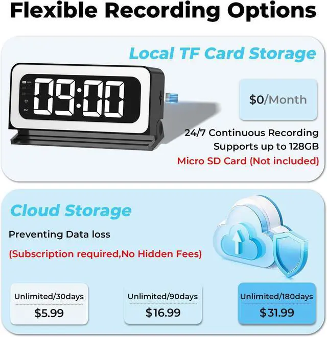 Dual Functionality & Long Battery Life: Combines a security camera with a fully functional digital clock; built-in 5200mAh battery supports up to 12 hours of continuous use, with USB-C charging included.