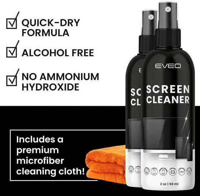 The Screen Cleaner Spray and Wipe Kit is the ultimate solution for keeping your screens spotless. This comprehensive kit includes two 4oz bottles of our highly effective screen cleaner spray, designed specifically for smart TVs, computers, laptops, iPhones, iPads, and other electronic devices. The included premium microfiber cloth ensures a streak-free finish, making it an essential addition to your laptop cleaning kit. Our TV screen cleaner for smart TVs provides an unparalleled clean, effectively removing fingerprints, smudges, and dust. Whether you're using it as a computer screen cleaner or a laptop screen cleaner, the results are always crystal clear. The screen cleaner spray and wipe kit is also perfect for maintaining the clarity of your monitor, offering a reliable solution for a computer cleaning kit. Not only does this screen cleaner spray work wonders on flat screen TVs, but it's also an excellent macbook screen cleaner. The macbook cleaning kit component ensures that your Apple devices are free from any distracting grime. This electronics cleaner is versatile, making it ideal for cleaning phone screens and other sensitive electronic surfaces. For those who prefer wipes, our kit includes monitor wipes and TV screen cleaner wipes, providing convenience and ease of use. The TV cleaner spray and cloth combination is designed to tackle tough stains, making it an essential tool for anyone who values a pristine viewing experience. In summary, the Screen Cleaner Spray and Wipe Kit offers a complete solution for all your screen cleaning needs. From TV screen cleaner for smart TVs to computer screen wipes, this kit has you covered. Keep your screens looking brand new with our advanced electronic cleaner, perfect for all your devices.