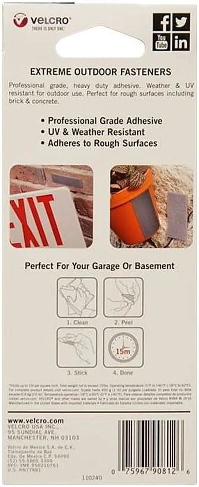 Use these strong hook-and-loop fasteners to hang addresses, safety notices, maps and other important items to building exteriors. The rugged adhesive on these 1x 4-inch strips is UV-resistant and sticks firmly to porous surfaces such as brick and concrete, creating dependable, lasting displays. This 10-set pack of Velcro industrial strength strips eliminates the need to drill or use epoxy, screws or nails.