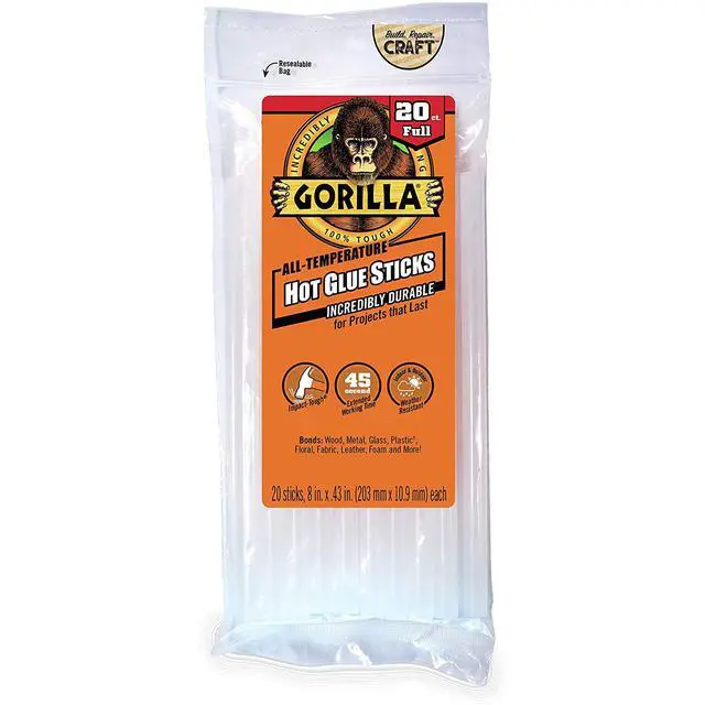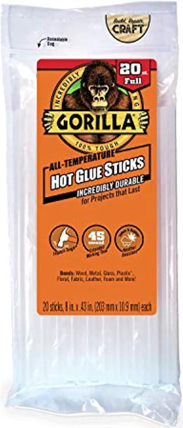 Incredibly tough & versatile, Gorilla Hot Glue Sticks provide a long term hold even on hard to bond surfaces. The clear adhesive works with both high and low temperature glue guns and features an extended working time for added convenience for all types of projects. Gorilla Hot Glue is also weather-resistant and incredibly durable, keeping your projects safe from seasonal temperature swings that can cause other glues to fail.