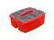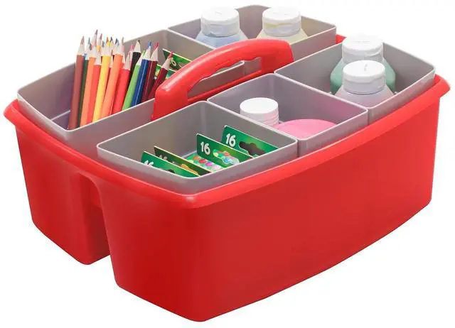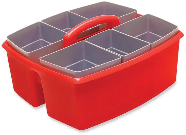This large caddy has two large compartments to store art supplies, washing accessories, or anything you need to keep handy. It has a comfort grip handle and is available in several bright colors. 6 cups can be used to store smaller supplies for arts and crafts, or scissors, glue sticks, paint brushes, etc. Completely dishwasher safe.