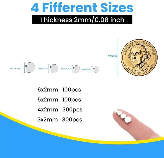 4 Different Size- Total of 400 Pcs can meet a variety of needs(3mm X 2mm X 300Pcs, 4mm X 2mm 300Pcs, 5mm X 2mm X 100Pcs, 6mm X 2mm X 100Pcs). Ideal as dry erase board magnets, push pins magnets, note or photo walls, crafts, DIY materials, etc