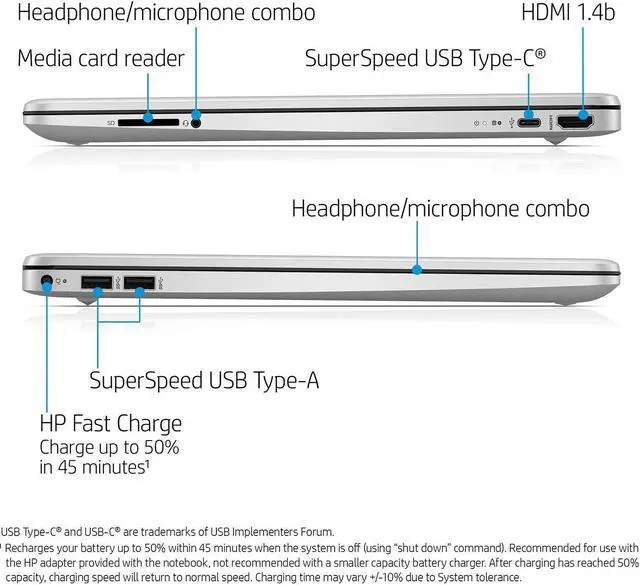 Ports: 1 x SuperSpeed USB Type-C 5Gbps signaling rate 2 x SuperSpeed USB Type-A 5Gbps signaling rate 1 x AC smart pin 1 x HDMI 1.4 b 1 x Headphone /