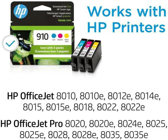Model: HP 910 3-pack Cyan/Magenta/Yellow Original Ink Cartridges