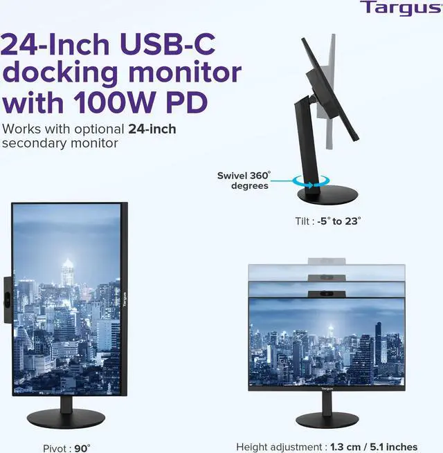The 24-inch USB-C Docking Monitor with 100W Power Delivery seamlessly incorporates an ultra-compatible Targus docking station into a 24" LCD display to create a clutter-free workspace. Equipped with high-resolution graphics and multiple ports, this docking display is made for productive professionals and offers compatibility with most laptop brands. Features adjustable height, screen tilt angle, 360 degree rotation and portrait/landscape mode. You'll love being able to have a horizontal and vertical monitor No need to fuss with messy wires and extra gadgets, you save valuable desktop real estate with the display's built-in speakers, two microphones, and a 2M Pixel webcam.