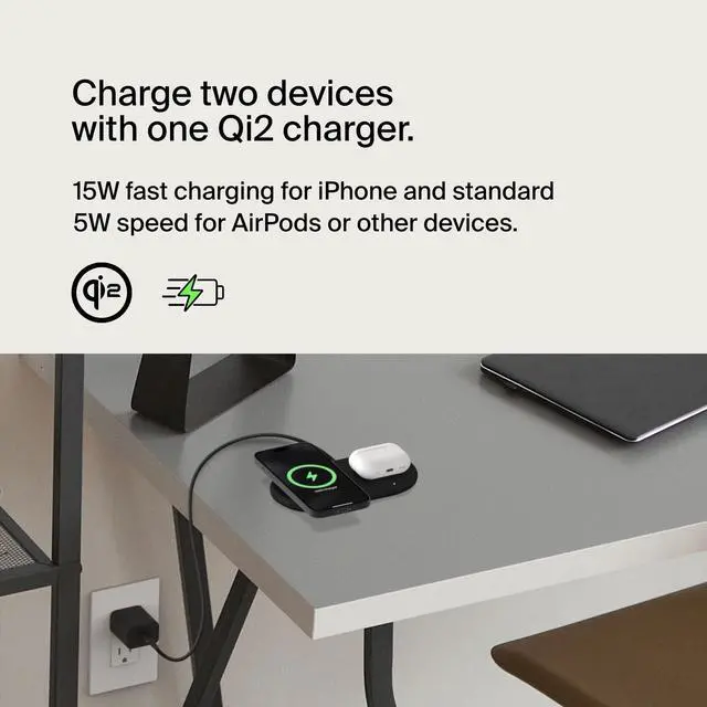 This 2-in-1 charging pad is equipped with dual charging surfaces, allowing you to charge two devices simultaneously. The Qi2 pad delivers up to 15W of rapid charging for your iPhone, while the additional Qi pad offers 5W of standard charging for your AirPods or other compatible devices. The inclusion of a 5W USB-C port further enhances its versatility, enabling you to charge an extra device via a wired connection.