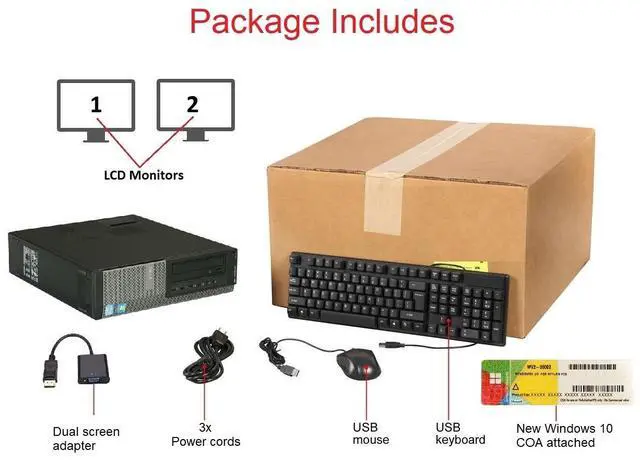 Bundle Description: Computer, Two LCDs, Mouse, Keyboard, Power cords, Dual Screen cables, VGA Cables and WiFi USB N adapter.