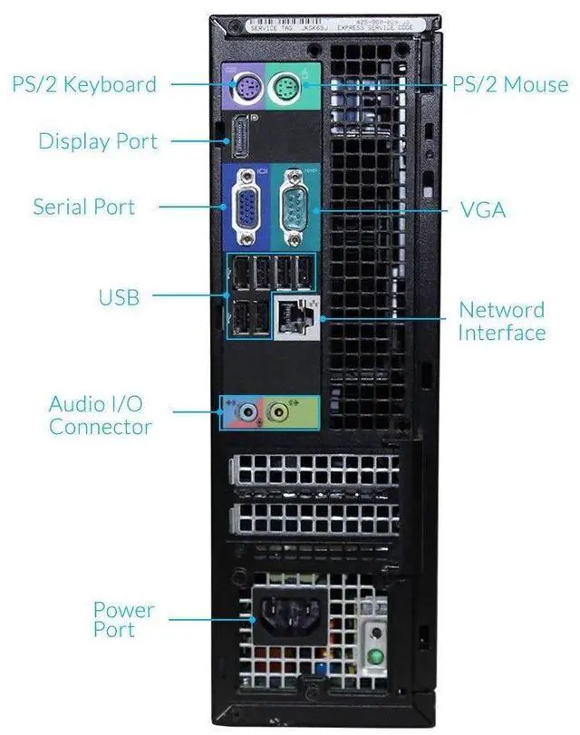 Connectivity: Ethernet, PS/2 Keyboard Connector, PS/2 Mouse Connector, Serial Connector (RS-232), 1/8" Line-in/Microphone, 1/8" Speaker Out, DisplayPort, USB 2.0, VGA