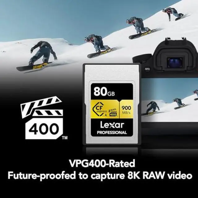 For professional creators who want to capture high-resolution images and cinema-quality 8K video, look no further than the Lexar Professional CFexpress Type A Card GOLD Series. With superior read speed up to 900MB/s, write speed up to 800MB/s, and Video Performance Grade 400 (VPG 400), this card not only allows you to capture with confidence today, it is future-proofed to capture 8K RAW video as well.