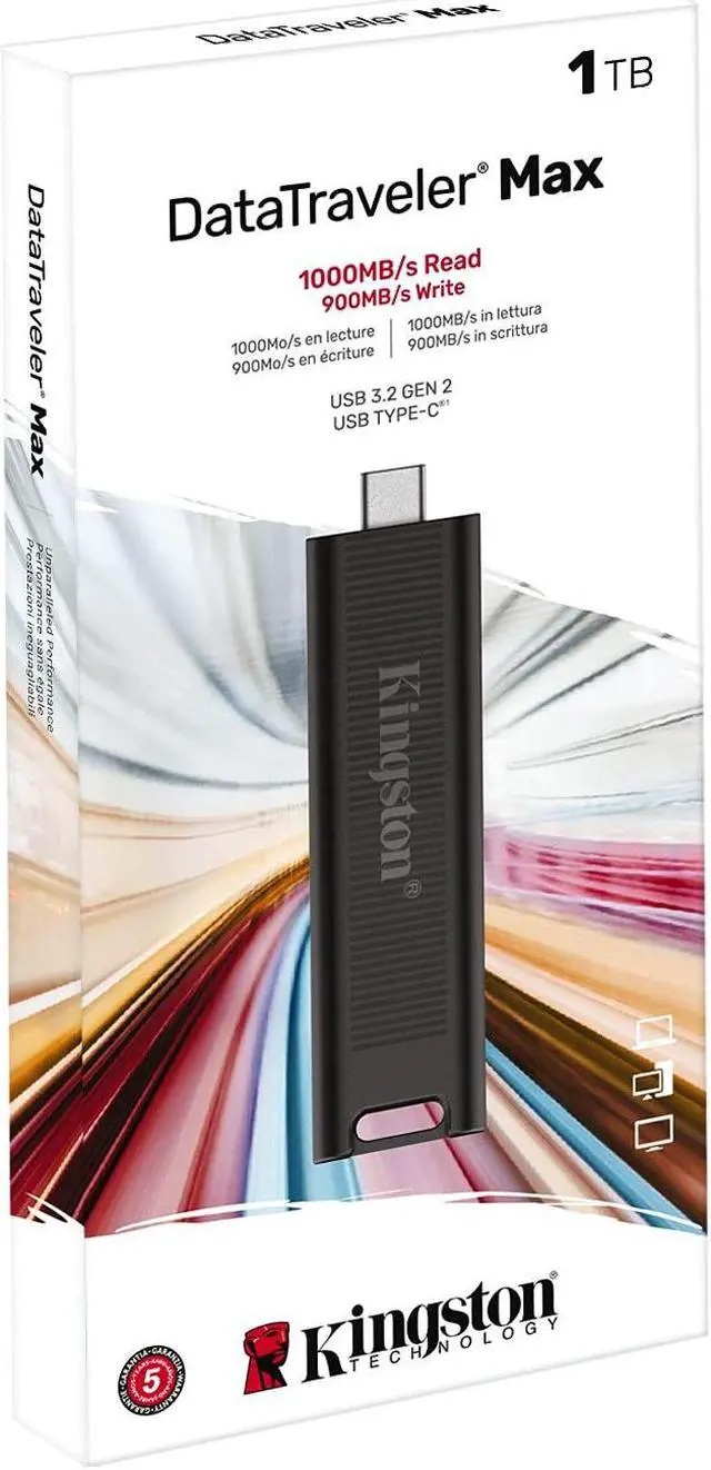 Kingston's DataTraveler Max is a high performance Type-C USB flash drive leveraging the latest USB 3.2 Gen 2 standard to deliver record-breaking read/write speeds up to 1, 000/900MB/s. Designed with portability and convenience in mind, the unique ridged casing protects the connector when not in use and is easily moved with a single motion. DT Max delivers premium performance and expanded capacities up to 1TB making it the ideal solution for transferring and storing large digital files such as HD photos, 4K/8K videos, music and more.