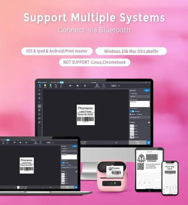 M220 barcode printer is quick and simple to generate labels with bar codes, qr code, shipping packages, logo, address and more.