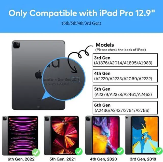 COMPATIBILTTY: This premium slim keyboard case is only compatible with iPad Pro 12.9 inch (6th/5th/4th/3rd gen), models include 2022 12.9inch iPad Pro 6th Generation (A2436/A2437/2764/A2766); 2021 12.9 inch Pro 5th Generation (A2378, A2379, A2461, A2462); 2020 12.9 inch Pro 4th Generation (A2229, A2069, A2232, A2233); 2018 12.9 inch Pro 3rd Generation (A1876, A2014, A1895, A1983).