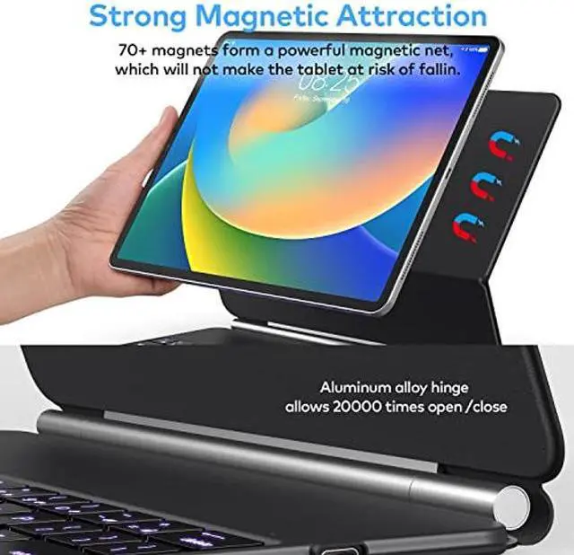 Easy-Set Magnetic Stand: you can attach your iPad to the back cover magnetically, Set the floating cantilever stand with one smooth motion, and transform your iPad turn your tablet into a highly performant and easy-to-use laptop within a second! Which is perfect for traveling, business, and school.