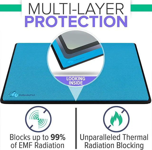 The DefenderPad Blocks: - Extremely Low Frequency (ELF) Radiation - Radio Frequency (RF) Radiation (WiFi, Bluetooth etc. ) - Heat Radiation How Does DefenderPad Work? The state-of-the-art technology of the DefenderPad laptop lap desk uses multiple layers of highly advanced shielding materials that work in unison to conduct, absorb, and dissipate unsafe levels of laptop and other electronic device emissions. Just place the DefenderPad between your device and your lap, and you can feel secure knowing you are protected anywhere, anytime with the all-in-one laptop radiation and heat shield. Why DefenderPad? The DefenderPad laptop lap desk is the perfect size to use at home or on the go. Its light and slim profile easily slips into computer bags, briefcases and backpacks for easy portability. The DefenderPad's protective technology and sleek design make it an ideal replacement for other lap devices like lap desks, lap trays, laptop tables and laptop cooling pads. Proudly made in the USA, the DefenderPad Laptop EMF Radiation & Heat Shield is free of BPA, BPS or other known environmental hazards, dangerous compounds and contaminants. Designed to fit up to 17" laptops