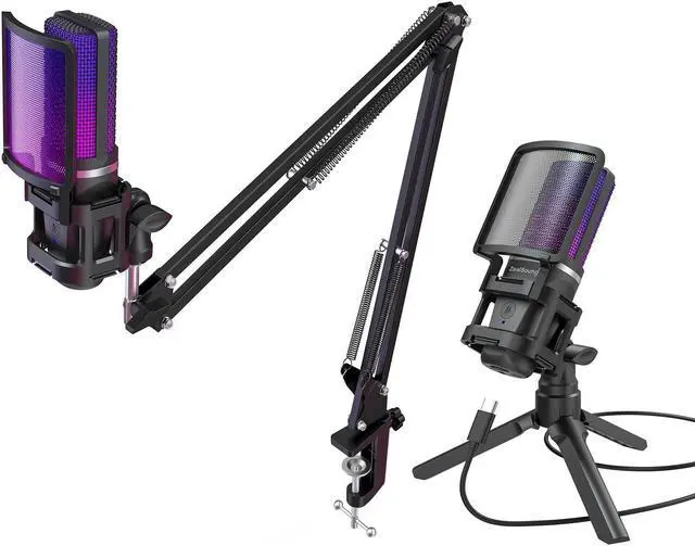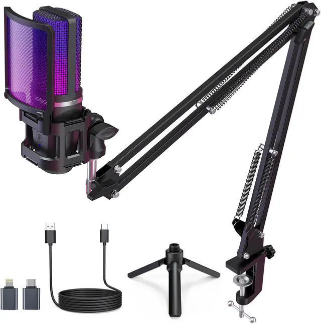 [(Premium Sound Quality)] This 96kHz RGB USB microphone captures every detail of your voice and delivers high-quality sound. Its Cardioid pickup pattern effectively eliminates background noise, and with the added benefit of a shock mount and detachable pop filter, your recording sessions are elevated to a new level of sonic perfection. Moreover, the collapsible mic tripod stand has been extended and enlarged, offering increased stability on your gaming desk to effectively minimize vibrations.