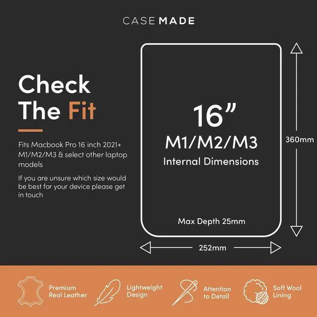 Casemade Real Leather Laptop Sleeve for MacBook Pro & Air Fits 13, 14, 15 & 16 Inch - Genuine Full Grain Leather with Soft Wool Lining (16 Inch - 2021+ M1/M2/M3)
