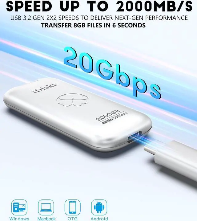 [(Universal Compatibility+Reliable Quality)] iDisk Portable SSD is your ideal storage expansion solution. It complies with USB 3.2 Gen2X2, offering both USB-C and USB-A (USB-C) cable with speeds of 20Gbps OTG function making this external ssd compatible with a wide range of devices such as Windows, Mac, Android, iPad, PC, Linux, PlayStation and Xbox gaming consoles etc
