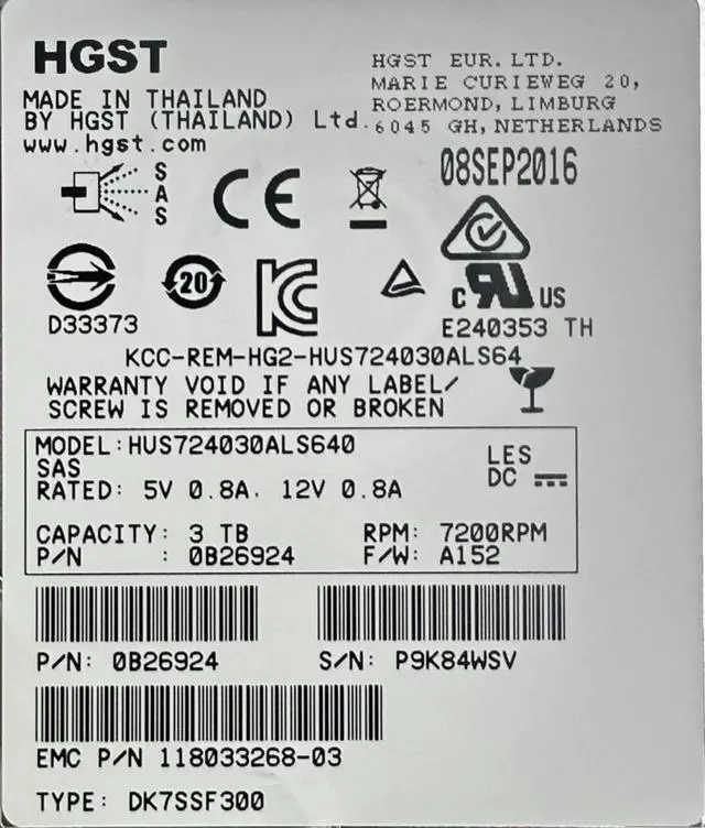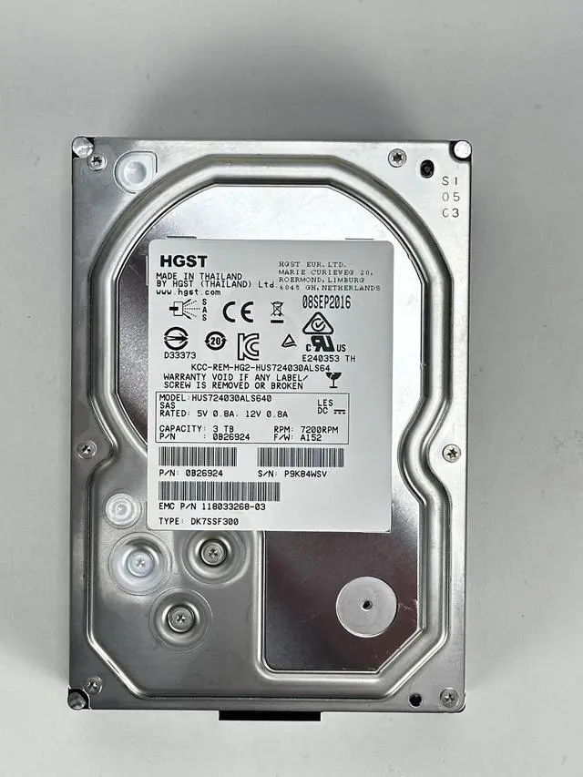 MPN: HUS724030ALS640, 0B29086, 118033268-03, DK7SSF300, 0B26924, KCC-REM-HG2-HUS724030ALS64, 7200RPM, SAS, HDD, LFF, 3.5, 3TB, Data, Domain, DD, Enity, VNX, ES30, 6G, NL