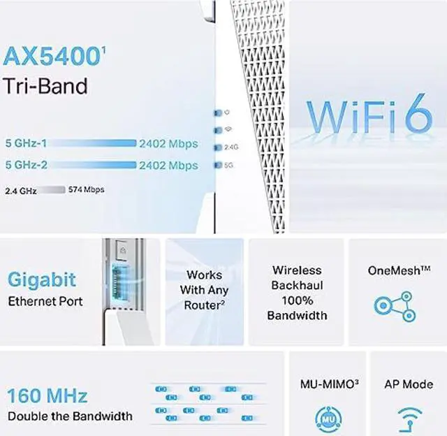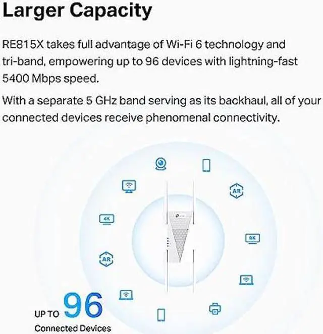 RE815X - AX5400 Mesh Wi-Fi 6 Range Extender AX5400 Tri-Band Blazing Wi-Fi The Tri-Band Wi-Fi with 1024-QAM and 160 MHz channel technology boosts overall speeds up to an incredible 5400 Mbps. Get More Range with Your Existing Router A single router has limited Wi-Fi coverage and always causes Wi-Fi dead zones. RE815X wirelessly connects to your existing router and boosts more Wi-Fi signals throughout your home, allowing you to enjoy smooth Wi-Fi 6 network experiences everywhere with great speed, capacity, and coverage. EasyMeshTM EasyMeshTM works as a whole home Wi-Fi solution between different access points, providing strong, seamless, stable, and scalable wireless connections covering your whole home stable connection.