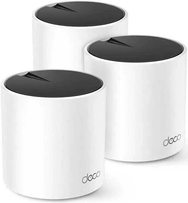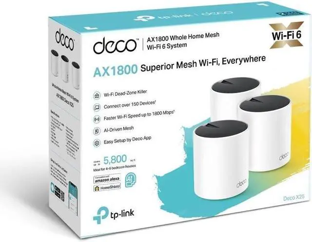 TP-LINK Deco X25 AX1800 whole-home mesh Wi-Fi 6 system boosts whole-home Wi-Fi coverage up to 5800 sq. ft. TP-Link Mesh means the Deco X25 units work together to form one unified network. Your phone or tablet automatically connects to the fastest Deco as you move through your home, creating a truly seamless Wi-Fi experience. Enjoy a more efficient network with way more average throughput on connected devices in dense environments thanks to the Wi-Fi 6 technology. Package includes (3) Deco X25 units, RJ45 Ethernet cable and (3) power adapters.