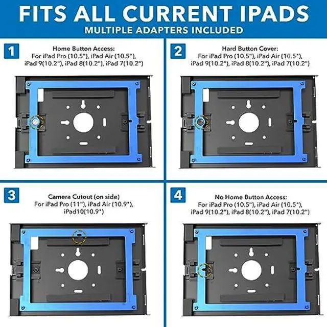 • FITS ALL IPADS: The unique universal enclosure of this check-in kiosk works with a wide range of iPads including the new GENERATION 10 iPads. Compatible tablet models are: iPad Pro (10.5", 11"), iPad Air (10.5", 10.9"), iPad 10 (10.9"), iPad 9 (10.2"), iPad 8 (10.2"), and iPad 7 (10.2"). Weight capacity of 2.2 lbs.