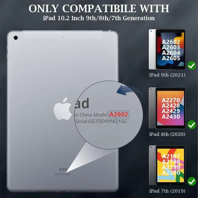 Compatibility --- Specially Designed Case for iPad 10.2 inch 9th Generation 2021 (Model: A2602 / A2603 / A2604 / A2605), iPad 10.2 inch 8th Generation 2020 (Model: A2270 / A2428 / A2429 / A2430 / A2197 / A2200 / A2198), iPad 10.2 inch 7th Generation 2019 (Model: A2197 / A2200 / A2198). Not compatible with any other devices.NOT fit any other iPad.Please check your iPad to avoid the incorrect model number.