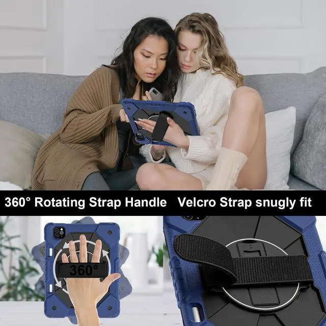 Built-in 360 Rotatable Kickstand + Hand Strap : 360-degree rotating swivel stand supports position of 3 angles(Vertical, Horizontal, and Halfway between), ideal for watching videos, conferences and travelling. Soft rotating handle strap prevents falling of tablet, featuring convenient use for school teachers, students, waiters, doctors, nurses and conference presenters.
