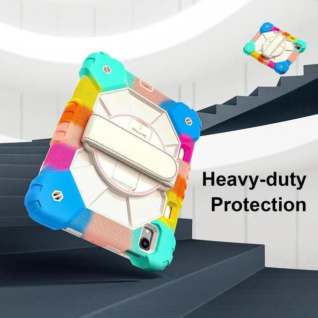 Built-in 360 Rotatable Kickstand + Hand Strap : 360-degree rotating swivel stand supports position of 3 angles(Vertical, Horizontal, and Halfway between), ideal for watching videos, conferences and travelling. Soft rotating handle strap prevents falling of tablet, featuring convenient use for school teachers, students, waiters, doctors, nurses and conference presenters.