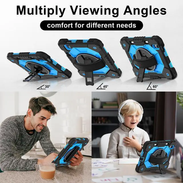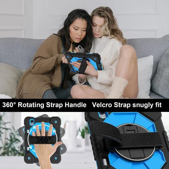 Built-in 360 Rotatable Kickstand + Hand Strap : 360-degree rotating swivel stand supports position of 3 angles(Vertical, Horizontal, and Halfway between), ideal for watching videos, conferences and travelling. Soft rotating handle strap prevents falling of tablet, featuring convenient use for school teachers, students, waiters, doctors, nurses and conference presenters.