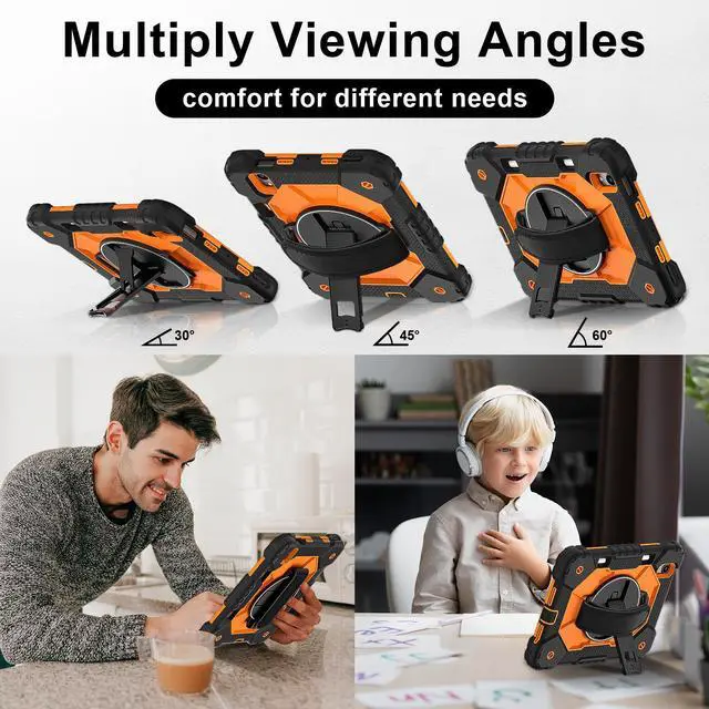 Built-in 360 Rotatable Kickstand + Hand Strap : 360-degree rotating swivel stand supports position of 3 angles(Vertical, Horizontal, and Halfway between), ideal for watching videos, conferences and travelling. Soft rotating handle strap prevents falling of tablet, featuring convenient use for school teachers, students, waiters, doctors, nurses and conference presenters.