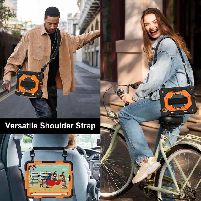 Adjustable Shoulder Strap : Adjustable shoulder grip can be slanted and release your hands completely. This function is perfect for traveling, restaurant ordering, home product introduction, engineer outdoor operation, scene of industrial construction,teacher, etc. Also, the strap allows you to hang up your tablet behind car seat for entertainment for kids.