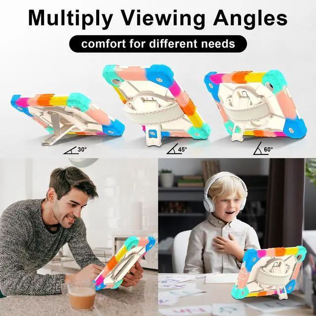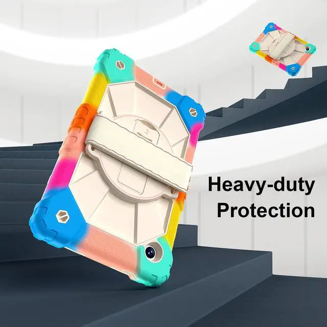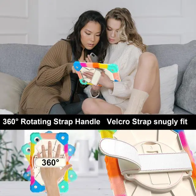 Built-in 360 Rotatable Kickstand + Hand Strap : 360-degree rotating swivel stand supports position of 3 angles(Vertical, Horizontal, and Halfway between), ideal for watching videos, conferences and travelling. Soft rotating handle strap prevents falling of tablet, featuring convenient use for school teachers, students, waiters, doctors, nurses and conference presenters.