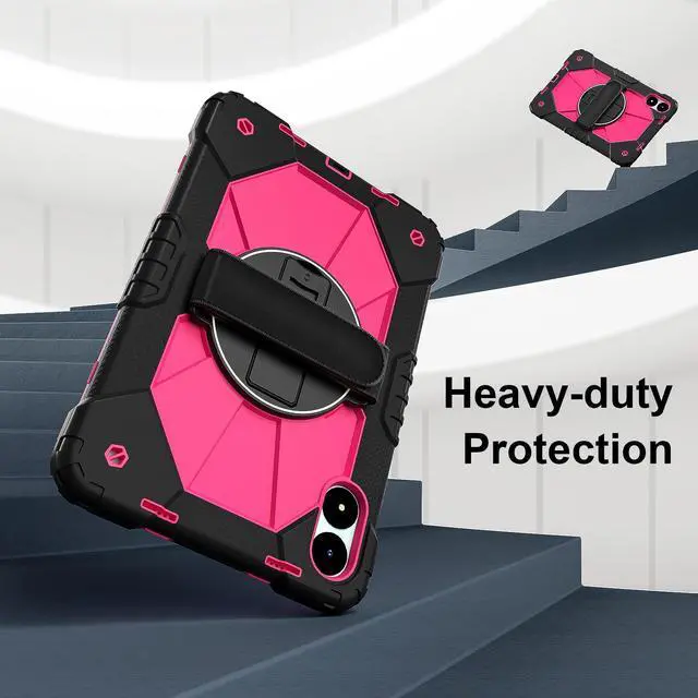 Built-in 360 Rotatable Kickstand + Hand Strap : 360-degree rotating swivel stand supports position of 3 angles(Vertical, Horizontal, and Halfway between), ideal for watching videos, conferences and travelling. Soft rotating handle strap prevents falling of tablet, featuring convenient use for school teachers, students, waiters, doctors, nurses and conference presenters.