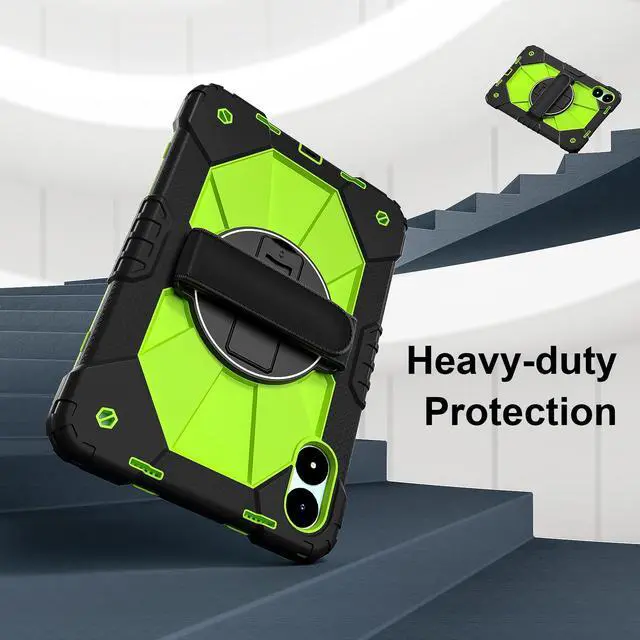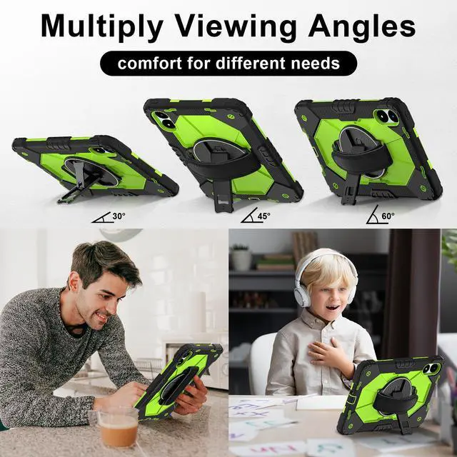 Built-in 360 Rotatable Kickstand + Hand Strap : 360-degree rotating swivel stand supports position of 3 angles(Vertical, Horizontal, and Halfway between), ideal for watching videos, conferences and travelling. Soft rotating handle strap prevents falling of tablet, featuring convenient use for school teachers, students, waiters, doctors, nurses and conference presenters.